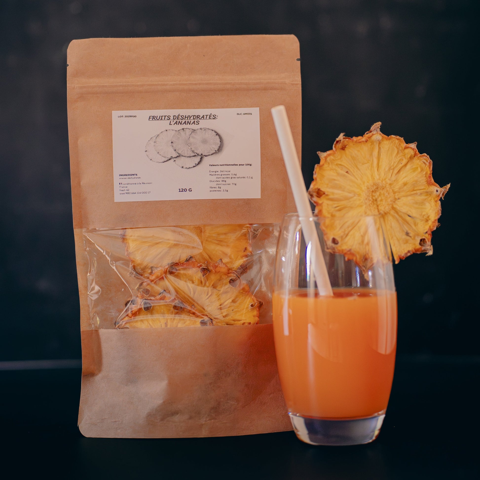 Sachet kraft 120 g de rondelles d’ananas déshydratées.